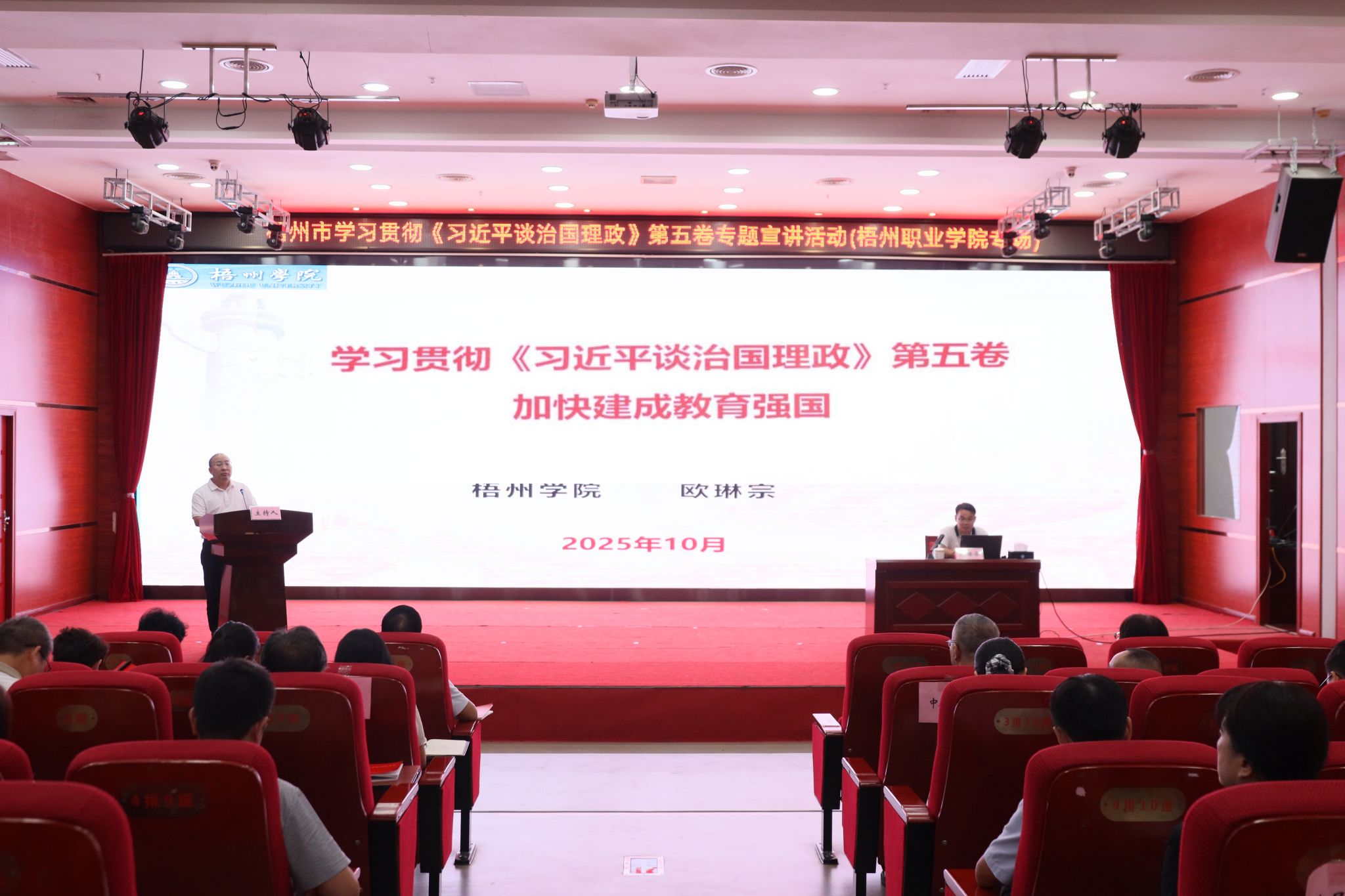 10月16日下午,学院(中心)在图书馆报告厅开展学习贯彻《习近平谈治国理政》第五卷专题宣讲活动。梧州学院马克思主义学院副院长、副教授欧琳宗作专题报告。我院党委书记时伟主持会议。