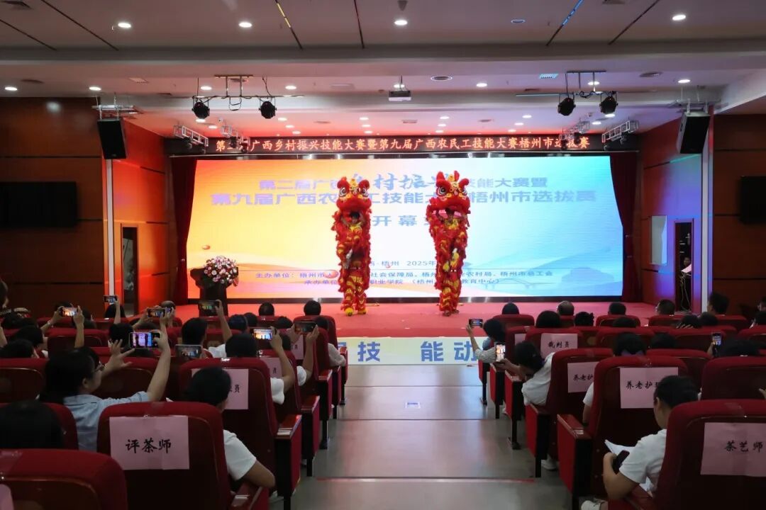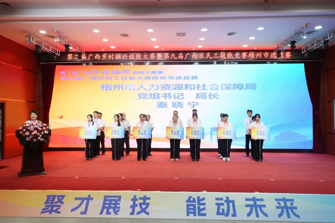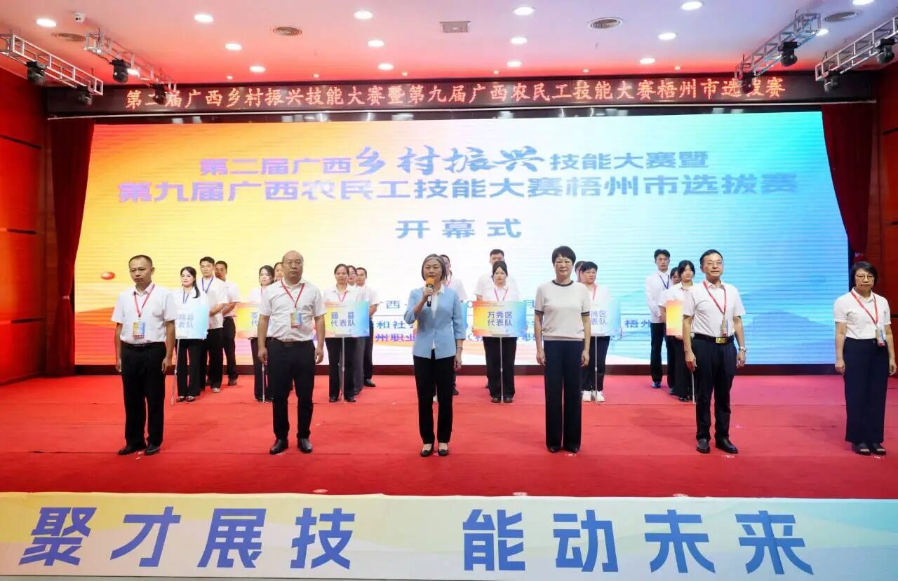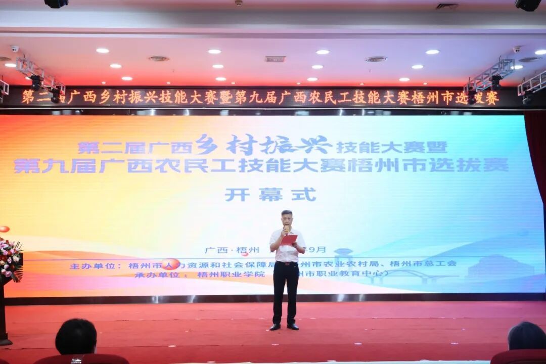开幕式由梧州市人力资源和社会保障局副局长徐斌同志主持。梧州市人社局党组书记、局长秦晓宁同志在开幕式中表示,梧州市 “十四五” 期间已累计对农村转移就业劳动者开展培训 5.5 万人次,赛事聚焦民生保障和重点劳务品牌培育,既是对培训成效的检验,也是选拔人才备战11月自治区决赛的 “练兵场”。她强调,选手要以赛打磨技能,力争代表梧州站上全区舞台,激励更多农民工走技能成才路。随后梧州市人民政府副市长苏颖同志宣布大赛开幕。