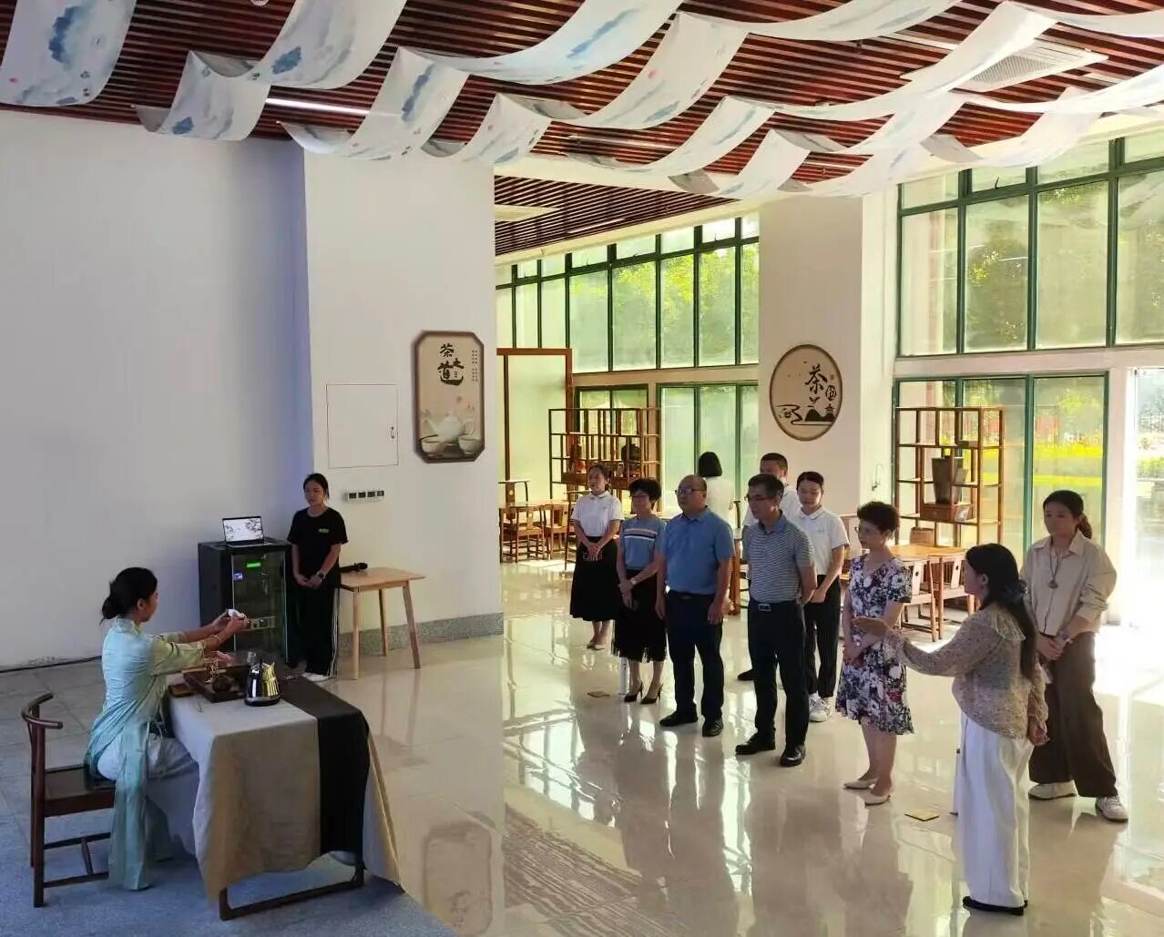 梧州市社科联一行首先参观了我校乡村产业振兴学院的广西梧州六堡茶产教融合实训基地,了解学院的茶产业人才培养情况。