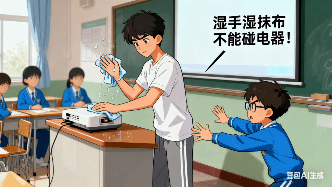 二、湿手和湿抹布不碰通电设备
