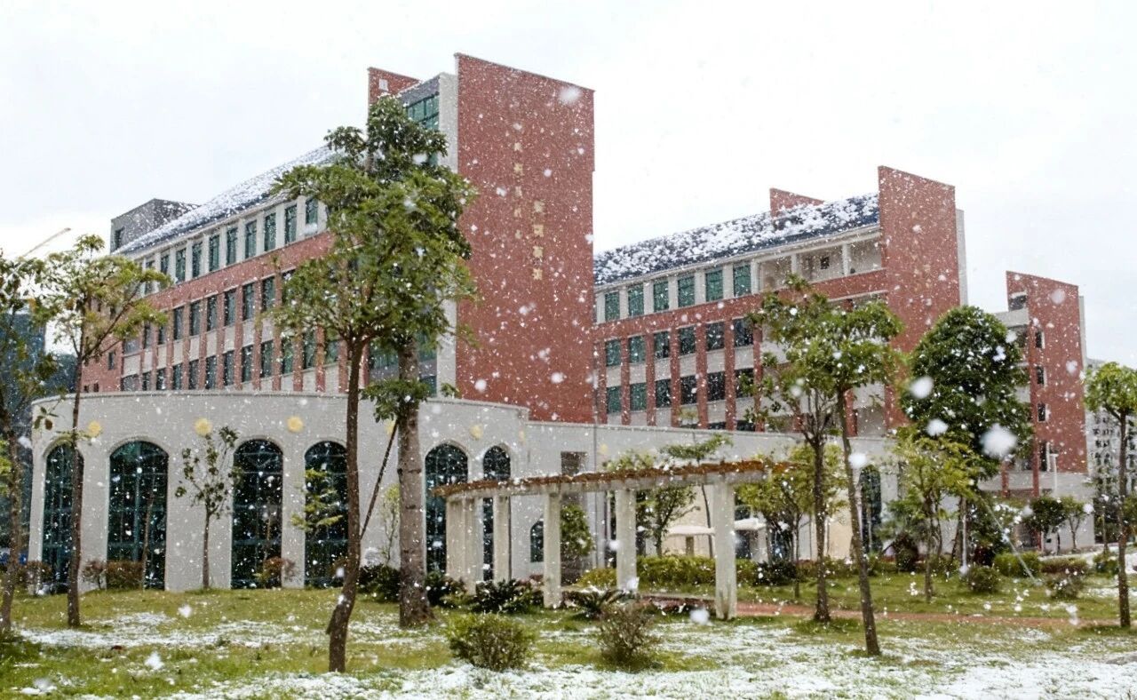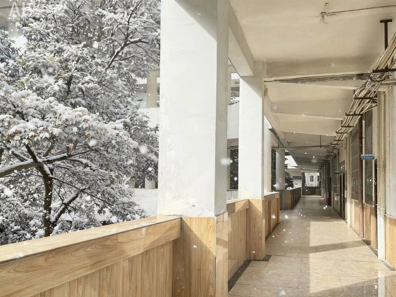 三角梅沾雪红砖楼檐凝霜雪花漫舞间走廊光影添了冬的静