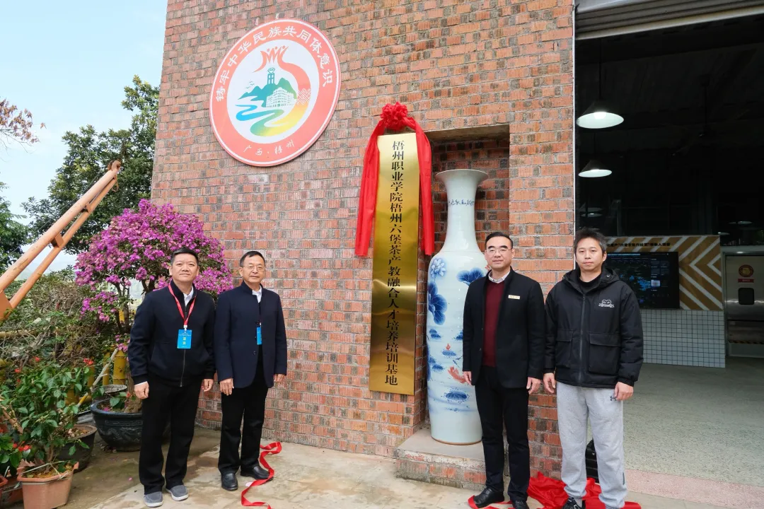 陈森英(左二)、王剑彪(左一)、陈科(右二)姚舜(右一)共同为梧州职业学院梧州六堡茶产教融合人才培养培训基地揭牌