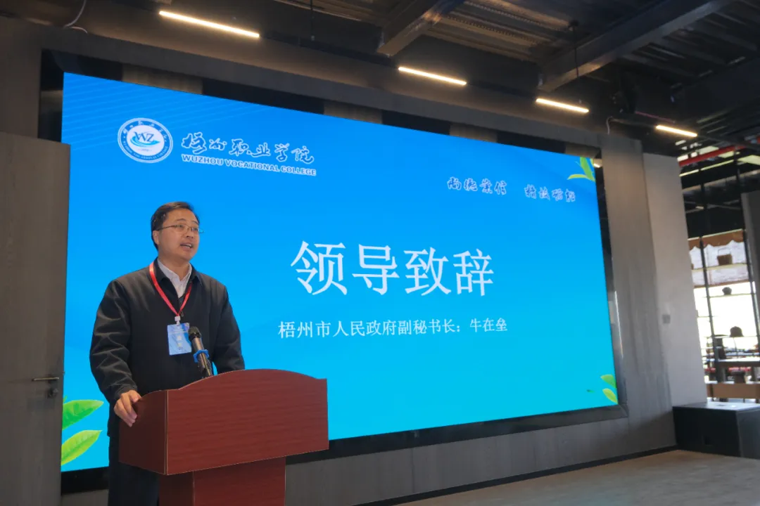 市人民政府副秘书长牛在垒在会议上致辞,向关心支持梧州职业教育与产教融合的各界人士致以敬意与感谢。他表示,过去一年联合体实现从蓝图到实体的跨越,在标准构建、协同育人、科技赋能上成效显著,市政府将持续深化产教融合,完善协同机制,以创新赋能品牌提升,助力六堡茶产业冲刺300亿元产值目标。
