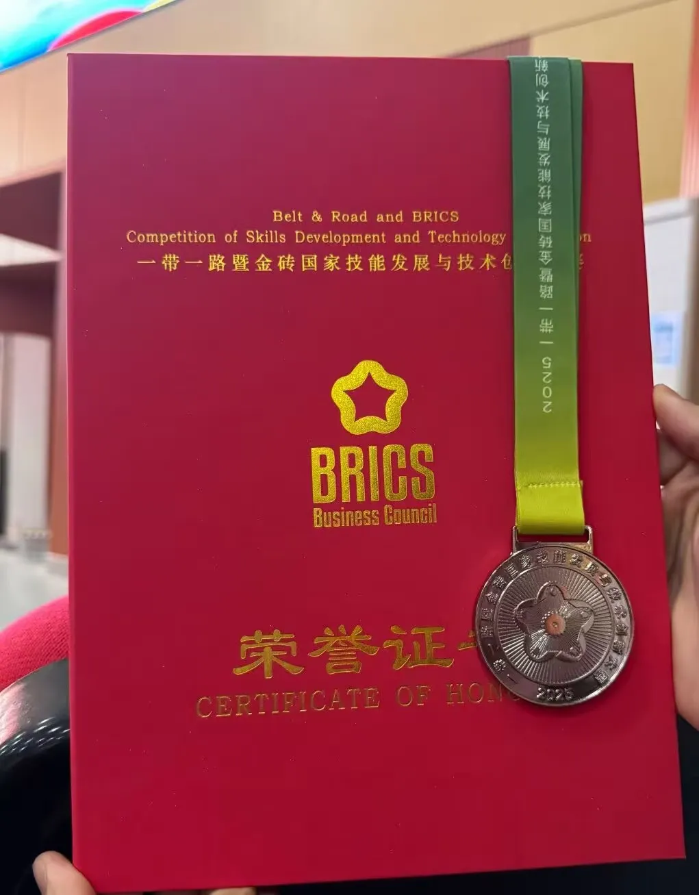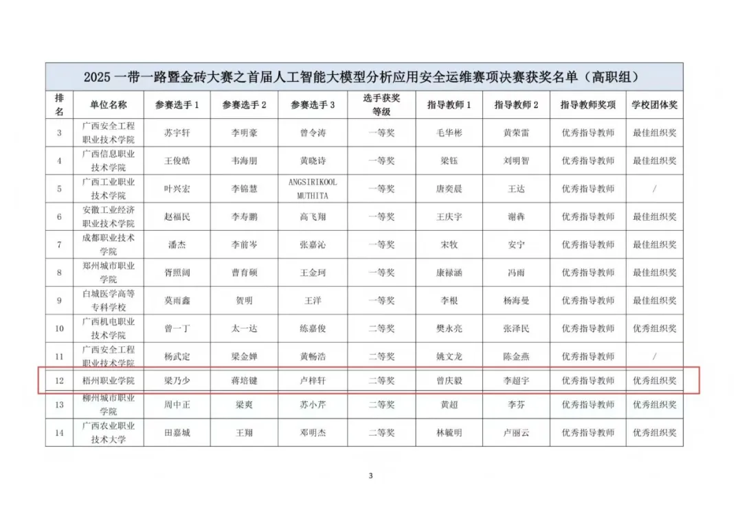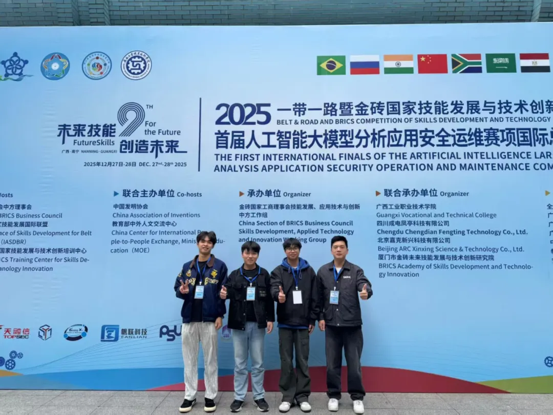 2025“一带一路”暨金砖国家技能发展与技术创新大赛之首届人工智能大模型分析应用安全运维赛项国际总决赛12月27日-28日在广西工业职业技术学院举办。我校电子信息工程学院参赛选手梁乃少、蒋培键和卢梓轩在此次比赛中获得全国高职组二等奖;梧州职业学院获得优秀组织奖;曾庆毅、李超宇两位教师获得优秀指导教师奖。
