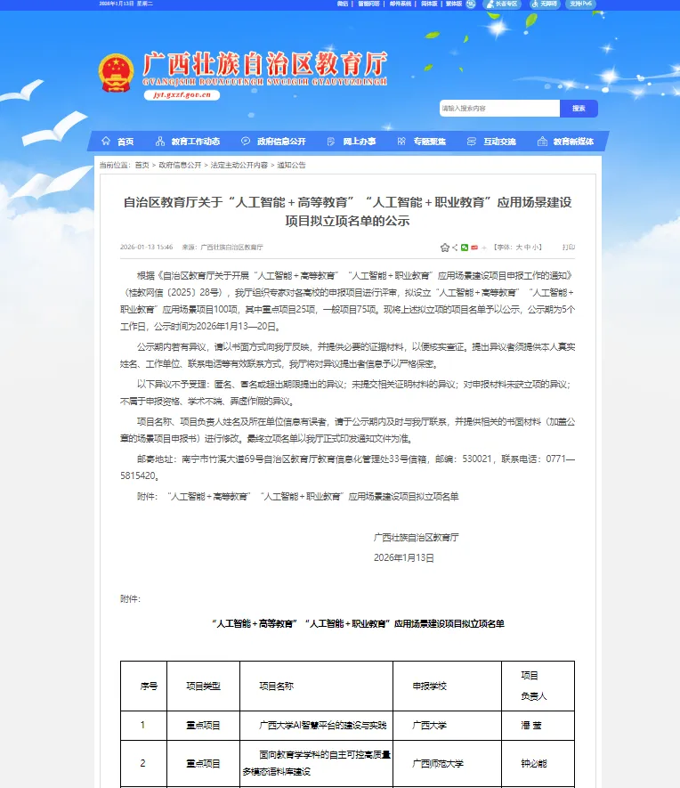 1月13日,广西壮族自治区教育厅对“人工智能+高等教育”“人工智能+职业教育”应用场景项目评审结果进行了公示,我校电子信息工程学院申报的“云边端协同智驾仿真:AIGC多模态实训平台”项目成功获批立项。