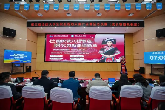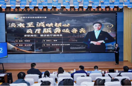 赛场上,学校学子展现出良好的专业素养与清晰的职业认知。成长赛道中,建筑环保工程学院戴美梦以“壮韵织就八桂春色,锦艺勾勒非遗新章”为主题,立志成为文创产品设计师,深耕非遗壮锦传承领域,其兼具情怀与可行性的职业规划思路获得评委认可;就业赛道里,商学院蒋婷聚焦酒店前厅接待员岗位,以“漓水至诚映初心,前厅服务暖宾朋”为核心,结合酒店管理与数字化运营专业知识,展现了贴合行业需求的职业素养。