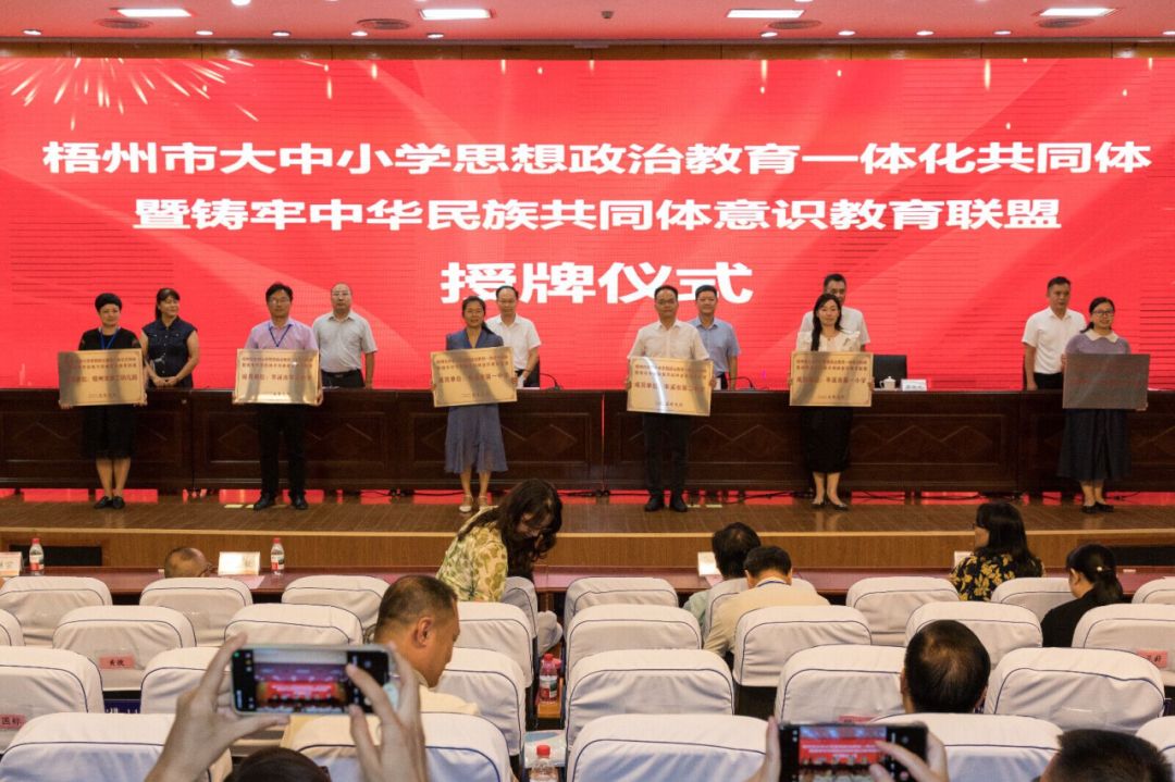 14日下午,培训会开幕式举行。会上宣读了梧州市大中小学思想政治教育一体化共同体暨铸牢中华民族共同体意识教育联盟成立文件,并给36家联盟单位授牌。
