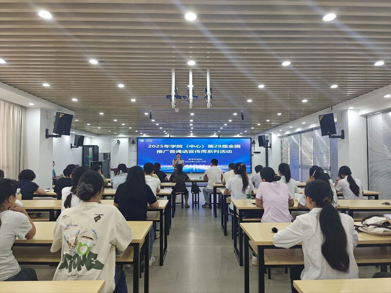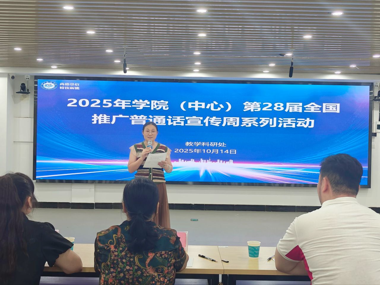 决赛现场首先由教学科研处副处长唐雯雯同志致欢迎词,对三位专家的莅临指导表示热烈欢迎和衷心感谢,她在致辞中强调,本次朗诵大赛是学院(中心)推普周系列活动的重要组成部分,既以竞赛形式为师生搭建了展示普通话水平、提升语言文字应用能力的重要平台。