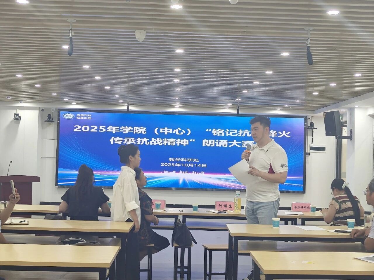 10月14日,学院(中心)在图书馆举办第28届全国推广普通话宣传周系列活动暨“铭记抗战烽火 传承抗战精神”朗诵大赛。本次活动邀请到梧州市教育科学研究所小学语文教研员、国家级普通话水平测试员梁影站长,梧州市龙圩区教育局教研室主任莫飞同志,梧州语航语言艺术工作室负责人付博生担任专家评委,教学科研处、各教学单位领导及师生代表近50余人参会。