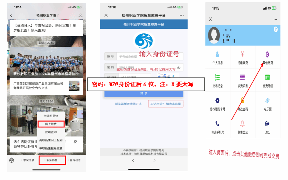 步骤1:关注梧州职业学院微信公众号公众号—进入公众号—点击“服务师生”—-“网上缴费”。