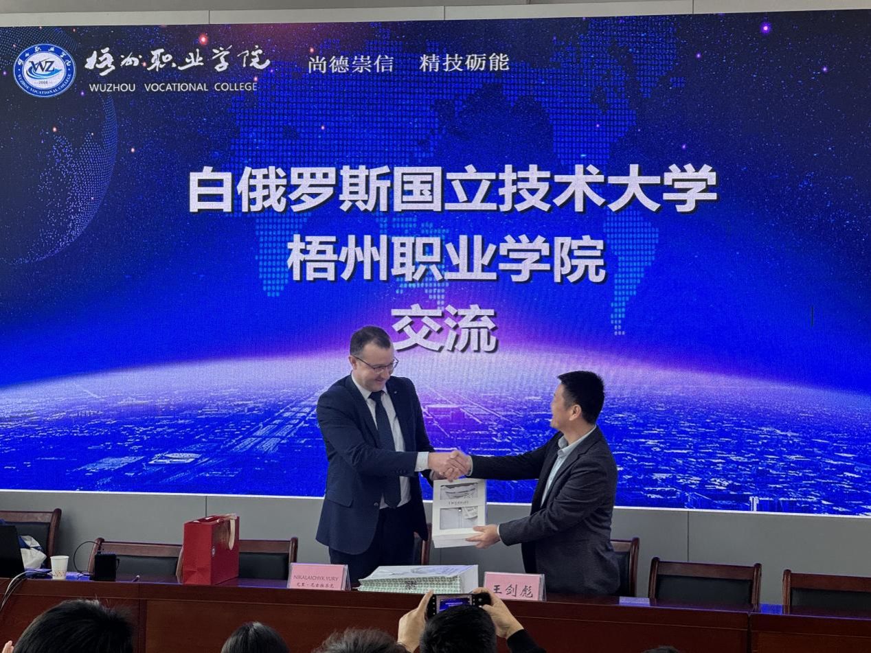讲座结束后,梧州职业学院党委副书记、学院院长王剑彪与 副校长尤里·尼古拉齐克 现场进行了 互赠伴手礼 。