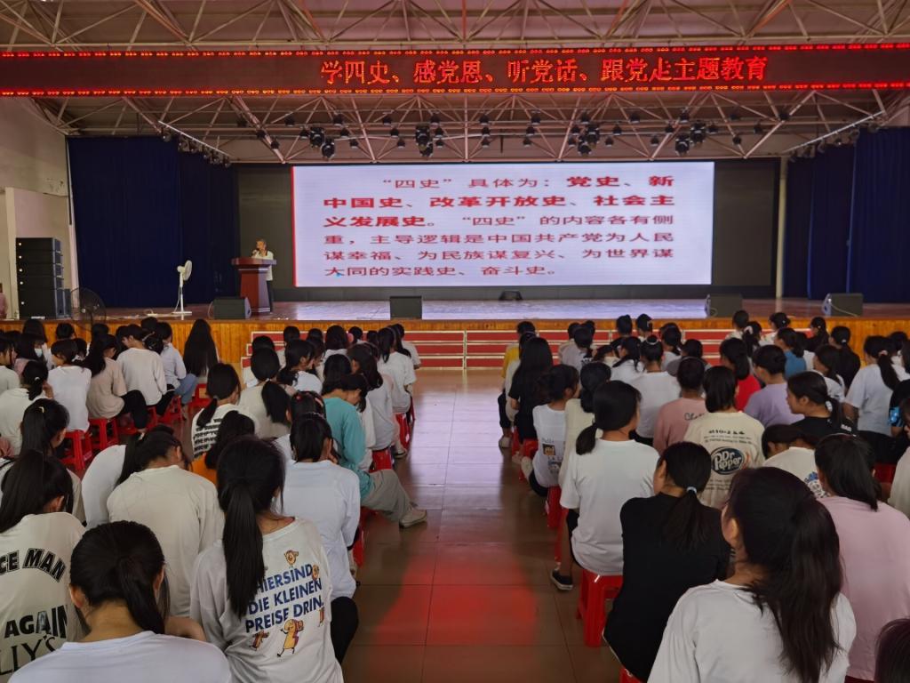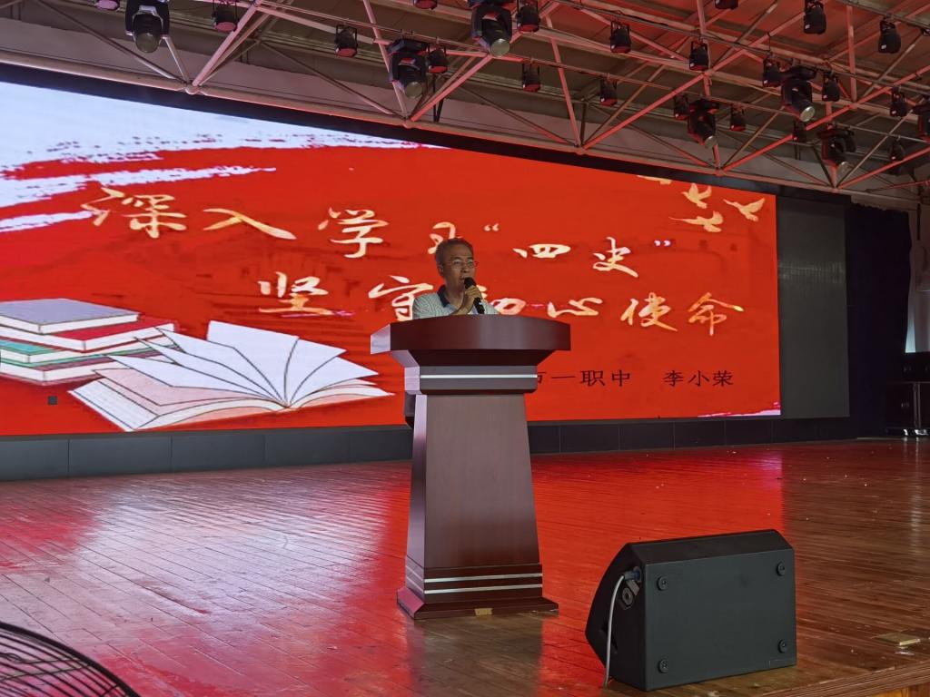 2021年5月31日上午,我校党支部利用校会时间对全校师生开展了“学四史、感党恩、听党话、跟党走”主题教育活动;学校党建室负责人李小荣老师给大家做了题为“深入学习四史,坚守初心使命”的宣讲。