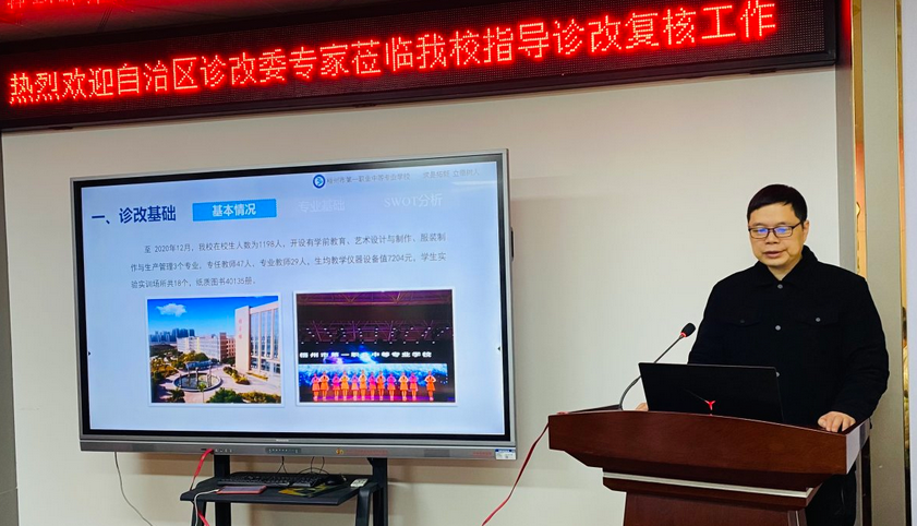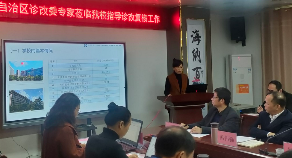 2023年3月30日,自治区教育厅诊改委专家梁庆铭、蓝雪涛、张传贵、曾瑞玲、裴海玲一行5人莅临梧州市一职中,对学校教学诊改工作进行现场复核,梧州职业学院副校长姚冰、梧州市一职中校级领导、中层干部、教研室主任、专业带头人出席了诊改复核会议。