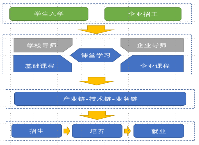 学校与企业进行校企双主体育人模式,由双方共同制定教学计划、共同开发课程、共同开展课题研发。将企业的实践经验编制成各种案例教材,以教师、师傅联合传授,将最前沿、最先进的技术经由企业师傅传承给学生,使得人才培养与产业链、技术链、业务链的“三链”对接得以全面落地,将现代学徒制落到了实处。将招生和就业工作前置到人才培养阶段,形成“招生-培养-就业”一体化局面,从而提高了人才培养质量和就业质量。