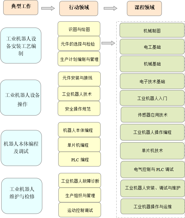 本专业培养学生德、智、体、美等全面发展,具有良好的科学文化素养、职业道德和扎实的文化基础知识。具有获取新知识、新技能的意识和能力,能适应不断变化的工作需求。熟悉企业生产流程,具有安全生产意识,严格按照行业安全工作规程进行操作,遵守各项工艺流程,重视环境保护,并具有独立解决非常规问题的基本能力。掌握现代工业机器人安装、调试、维护方面的专业知识和操作技能,具备机械结构设计、电气控制、传感技术、智能控制等专业技能,能从事工业机器人系统的调试、操作、销售及工业机器人应用系统维护维修与管理等工作的高素质高技能型人才。