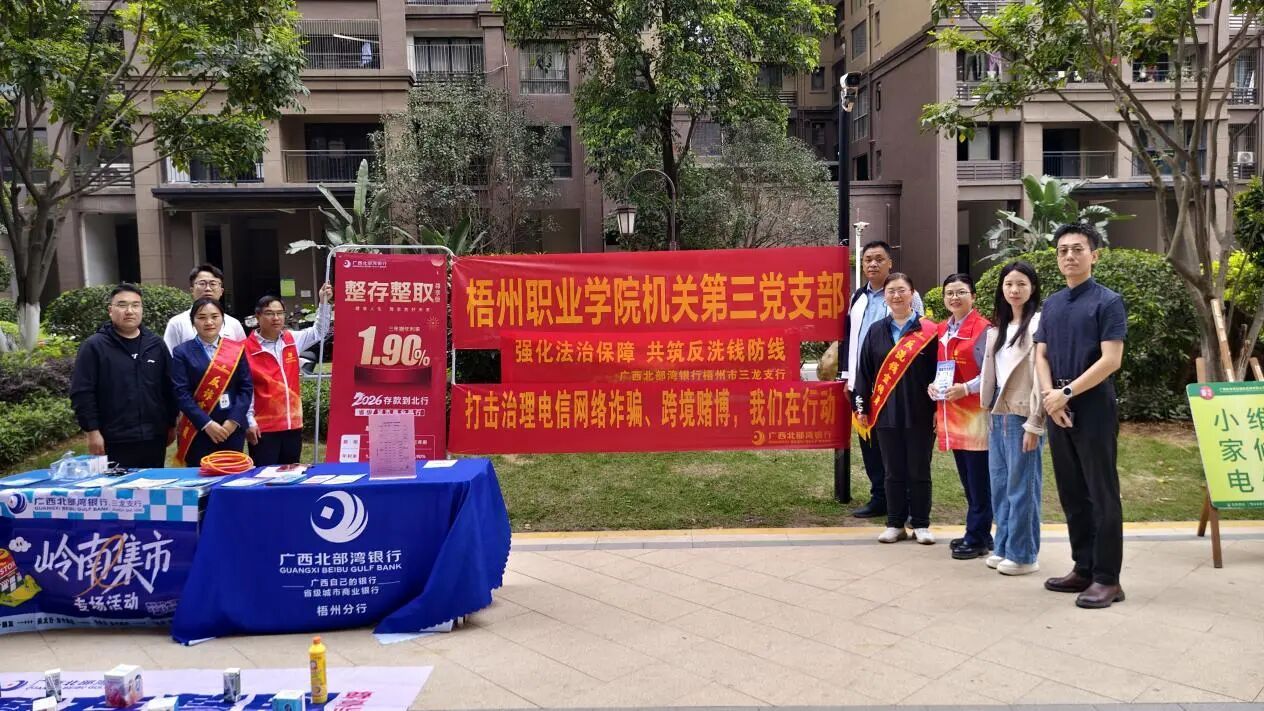3月22日上午,梧州职业学院机关第三党支部携手广西北部湾银行梧州市三龙支行,以党建带团建为引领,走进彰泰玫瑰园小区,开展 “我为群众办实事” 便民服务日活动,把暖心服务、金融安全与文化体验送到居民家门口,以实干践行初心使命。