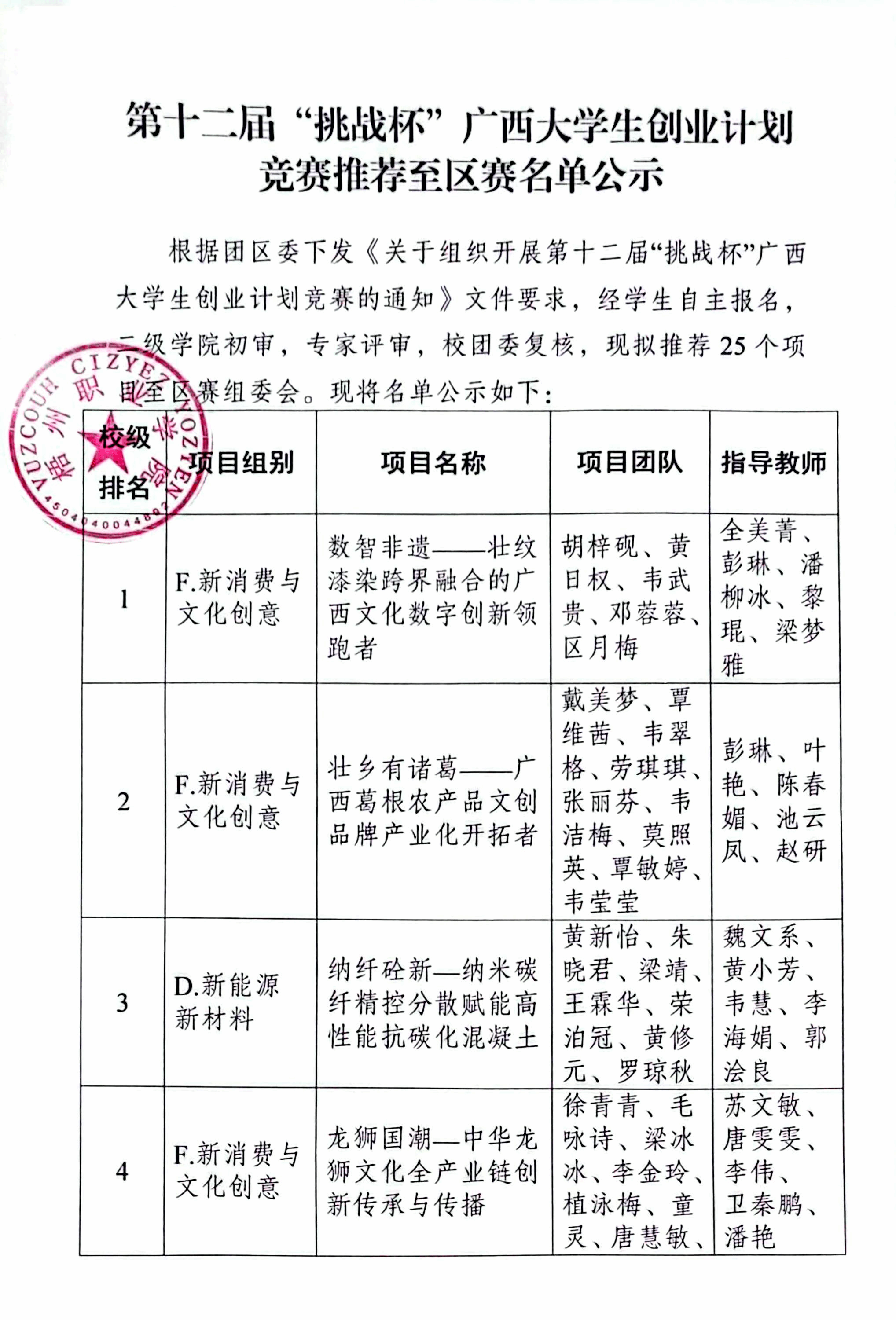 第十二届“挑战杯”广西大学生创业计划竞赛推荐至区赛名单公示